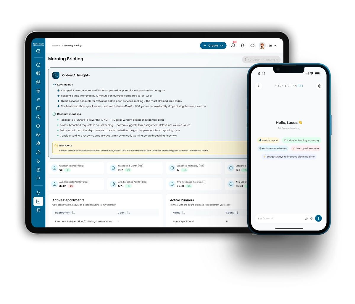 - Live hotel data, always connected: Every room, task, and reading already inside OptemAi.