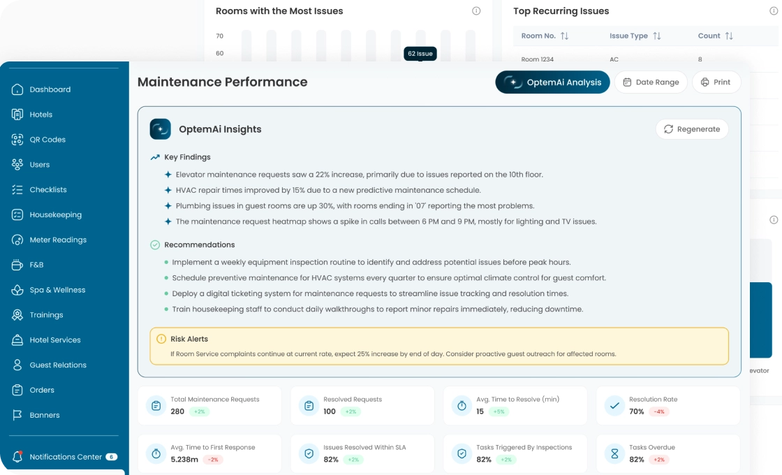 Utilize OptemAi to analyze maintenance reports and identify hidden patterns. Receive proactive recommendations to fix repeating equipment failures before they impact your guest’s overall stay.