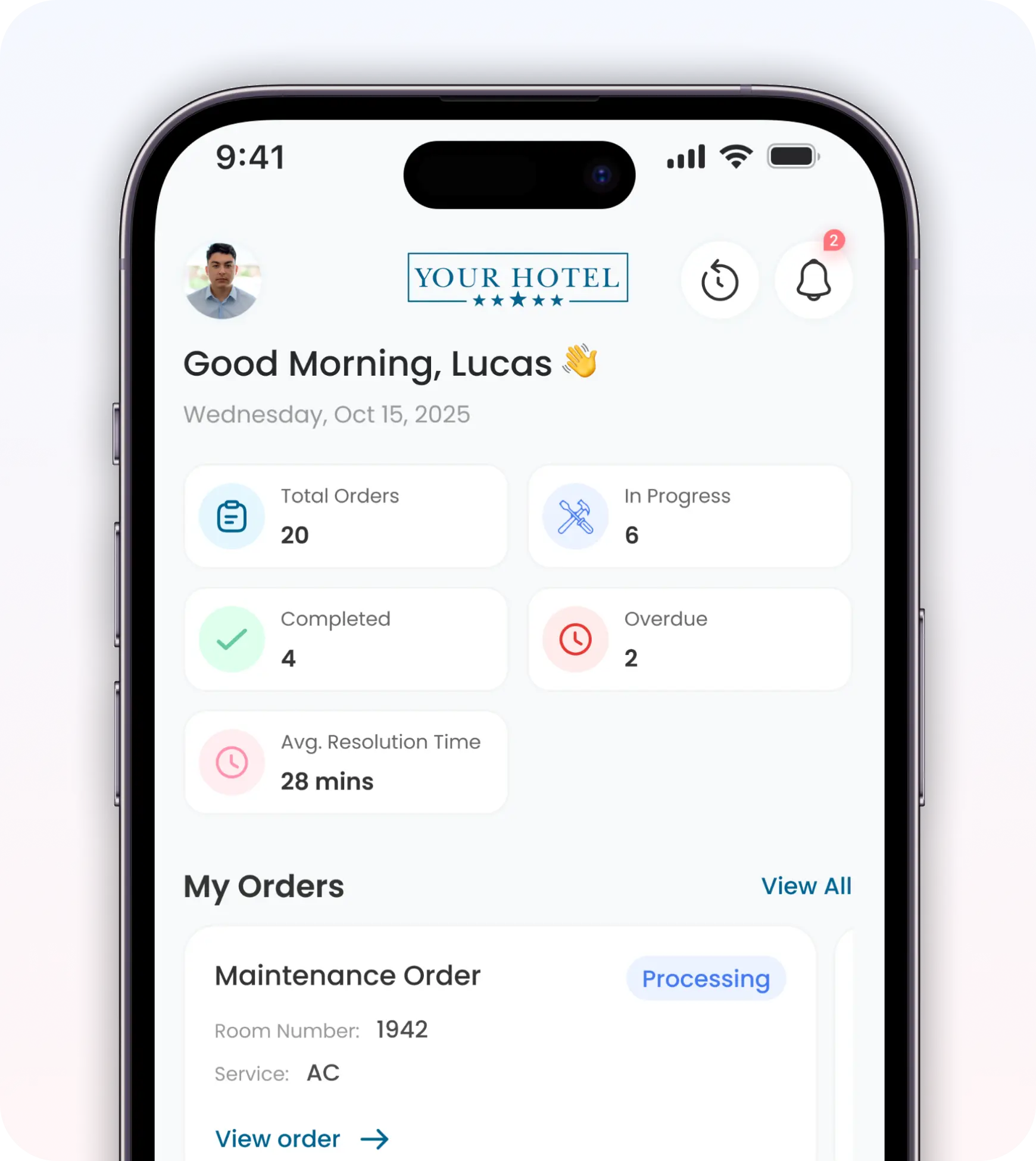 Instantly create, assign, and track digital work orders. Any staff member can report an issue with photos , and the ticket is routed to the right engineer.