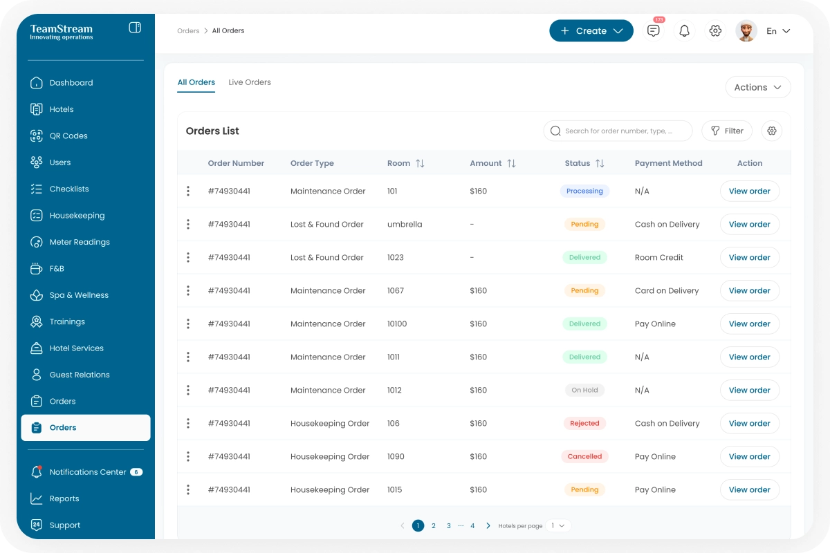 Replace scattered communication. TeamStream+ consolidates housekeeping, maintenance, and F&B into a single platform, ensuring every task is tracked and completed on time.