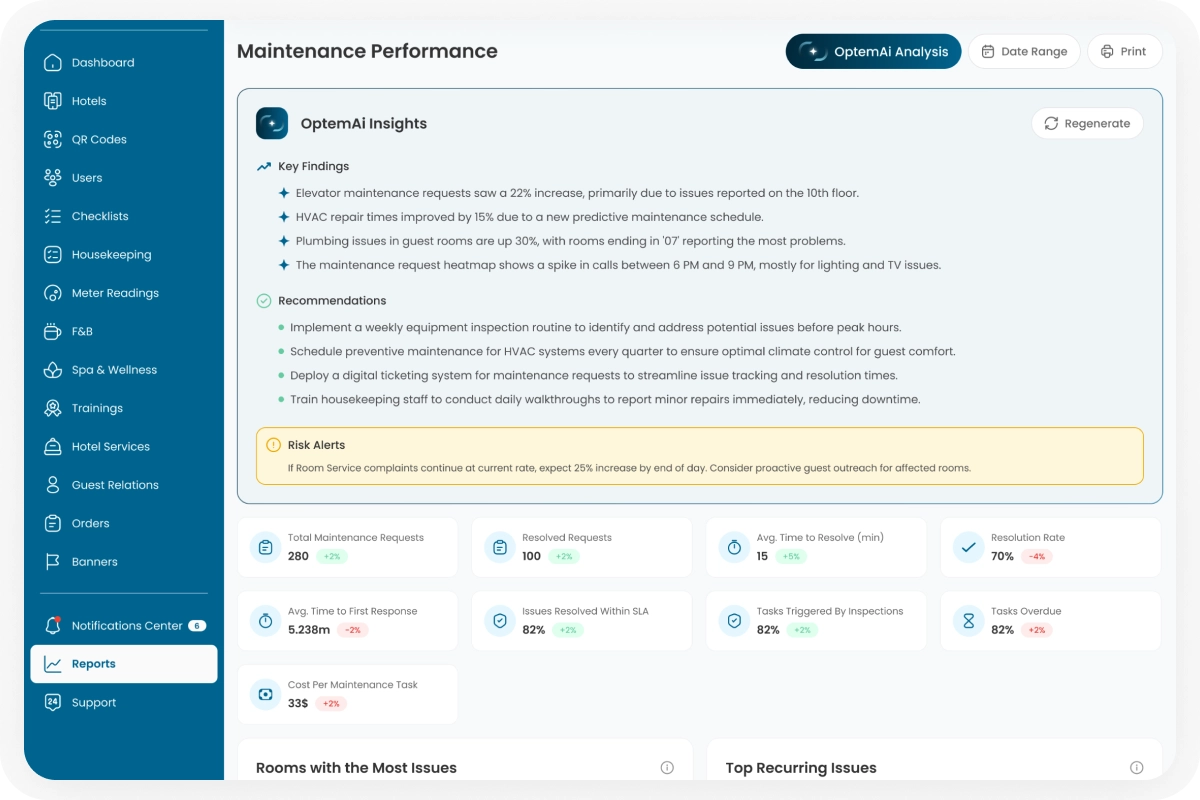 Access visual dashboards and AI insights to monitor staff workloads and recurring hotel issues.